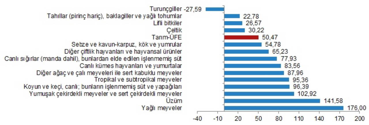 Yıllık artışın düşük olduğu alt gruplar sırasıyla, yüzde 22,78 ile tahıllar (pirinç hariç), baklagiller ve yağlı tohumlar ve yüzde 26,57 ile lifli bitkiler oldu.
