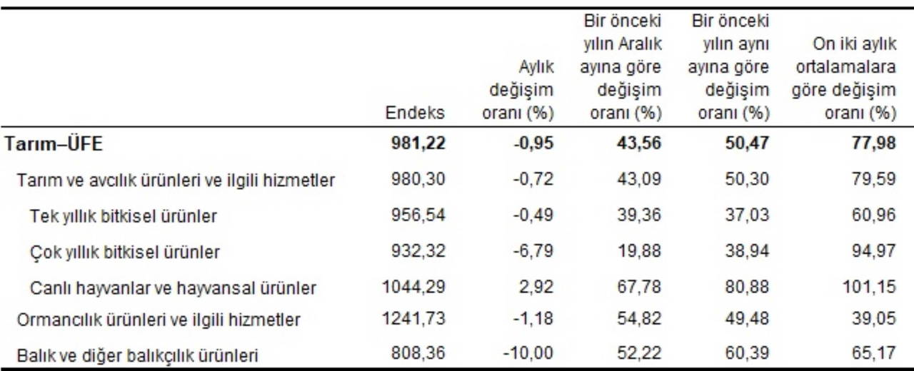 Ana gruplarda bir önceki aya göre tek yıllık bitkisel ürünlerde yüzde 0,49 azalış, çok yıllık bitkisel ürünlerde yüzde 6,79 azalış ve canlı hayvanlar ve hayvansal ürünlerde yüzde 2,92 artış gerçekleşti.