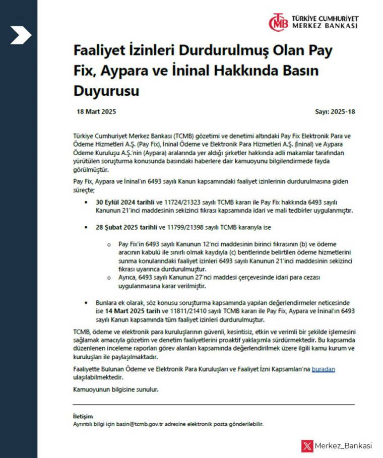- Açıklamada da bunlara ek olarak, söz konusu soruşturma kapsamında yapılan değerlendirmeler neticesinde ise 14 Mart 2025 tarih ve 11811/21410 sayılı TCMB kararı ile Pay Fix, Aypara ve İninal’ın 6493 sayılı Kanun kapsamında tüm faaliyet izinlerinin durdurulduğu vurgulandı.