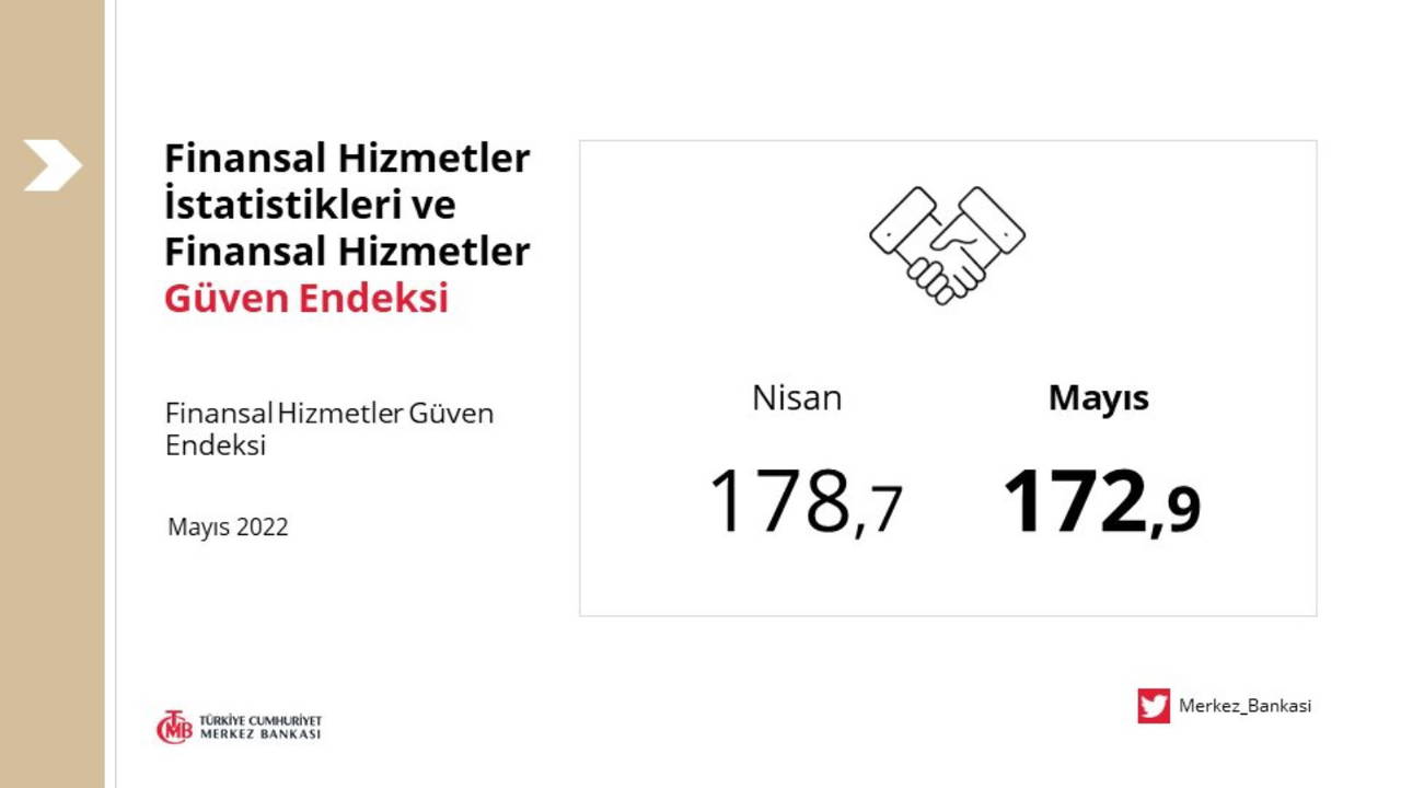 Merkez Bankası'ndan yapılan açıklamada, "2022 yılı mayıs ayında finansal hizmetler anketi sonuçları, finansal sektörde faaliyet gösteren 155 kuruluşun yanıtlarının ağırlıklandırılıp toplulaştırılmasıyla elde edilerek değerlendirilmiştir. 2022 yılı mayıs ayında FHGE, bir önceki aya göre 5,8 puan düşüş kaydederek 172,9 seviyesinde gerçekleşmiştir. Endeksi oluşturan anket sorularına ait yayılma endeksleri incelendiğinde, son 3 aydaki iş durumu, son 3 aydaki hizmetlere olan talep ile gelecek 3 aydaki hizmetlere olan talep beklentisi olmak üzere tüm alt endekslerin FHGE'yi azalış yönünde etkilediği görülmektedir" denildi.