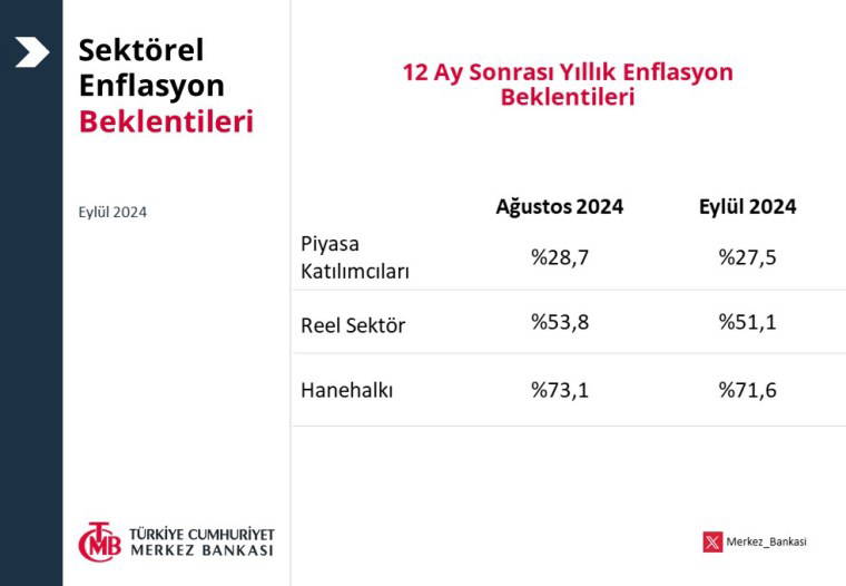 TCMB'den yapılan açıklamaya göre; Piyasa Katılımcıları Anketi, İktisadi Yönelim Anketi ve Türkiye İstatistik Kurumu iş birliğiyle yürütülen Tüketici Eğilim Anketi ile finansal ve reel sektör uzmanlarının, imalat sanayi firmalarının ve hanehalkının 12 ay sonrası yıllık tüketici enflasyonu beklentileri derlenerek sektörel enflasyon beklentileri elde edildi. 2024 yılı Eylül ayında 12 ay sonrası yıllık enflasyon beklentileri bir önceki aya göre, piyasa katılımcıları için 1,2 puan azalarak yüzde 27,5 seviyesine, reel sektör için 2,7 puan azalarak yüzde 51,1 seviyesine, hane halkı için 1,5 puan azalarak yüzde 71,6 seviyesine geriledi.