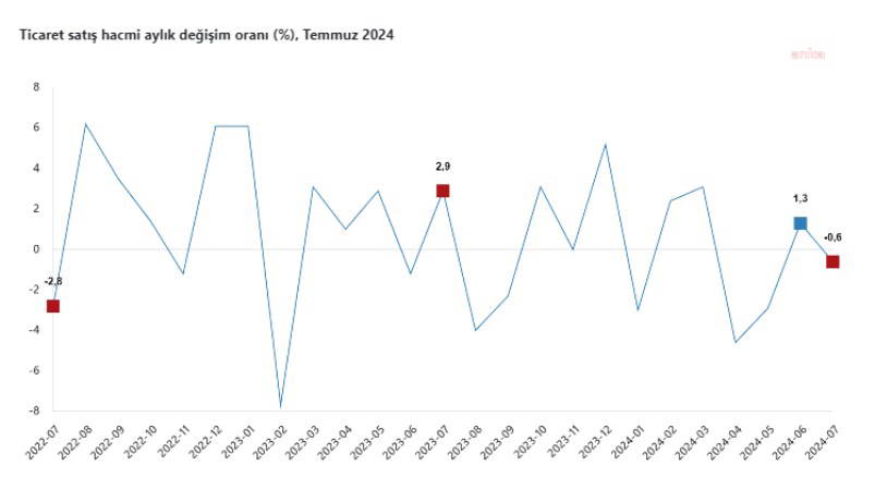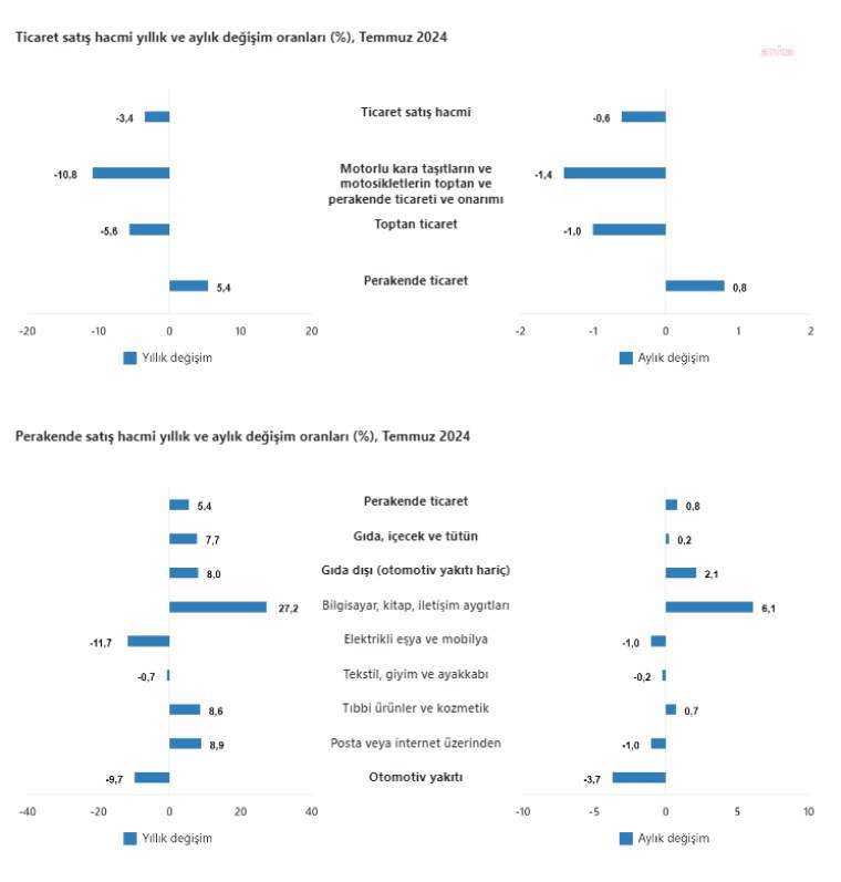 TÜİK, temmuz ayı ticaret satış hacim endeksi verilerini yayımladı. Buna göre; ticaret satış hacmi (2021=100) temmuz ayında bir önceki yılın aynı ayına göre yüzde 3,4 azaldı. Aynı ayda motorlu kara taşıtlarının ve motosikletlerin toptan ve perakende ticareti ile onarımı için satış hacmi yüzde 10,8, toptan ticaret satış hacmi yüzde 5,6 azaldı. Perakende ticaret satış hacmi ise yüzde 5,4 arttı.