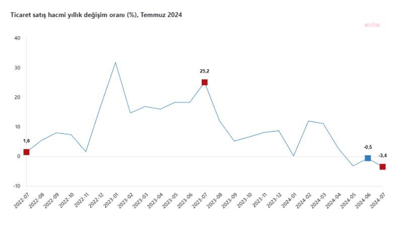 Türkiye İstatistik Kurumu (TÜİK) verilerine göre, temmuz ayında ticaret satış hacmi yıllık yüzde 3,4 azaldı, perakende satış hacmi yıllık yüzde 5,4 arttı.