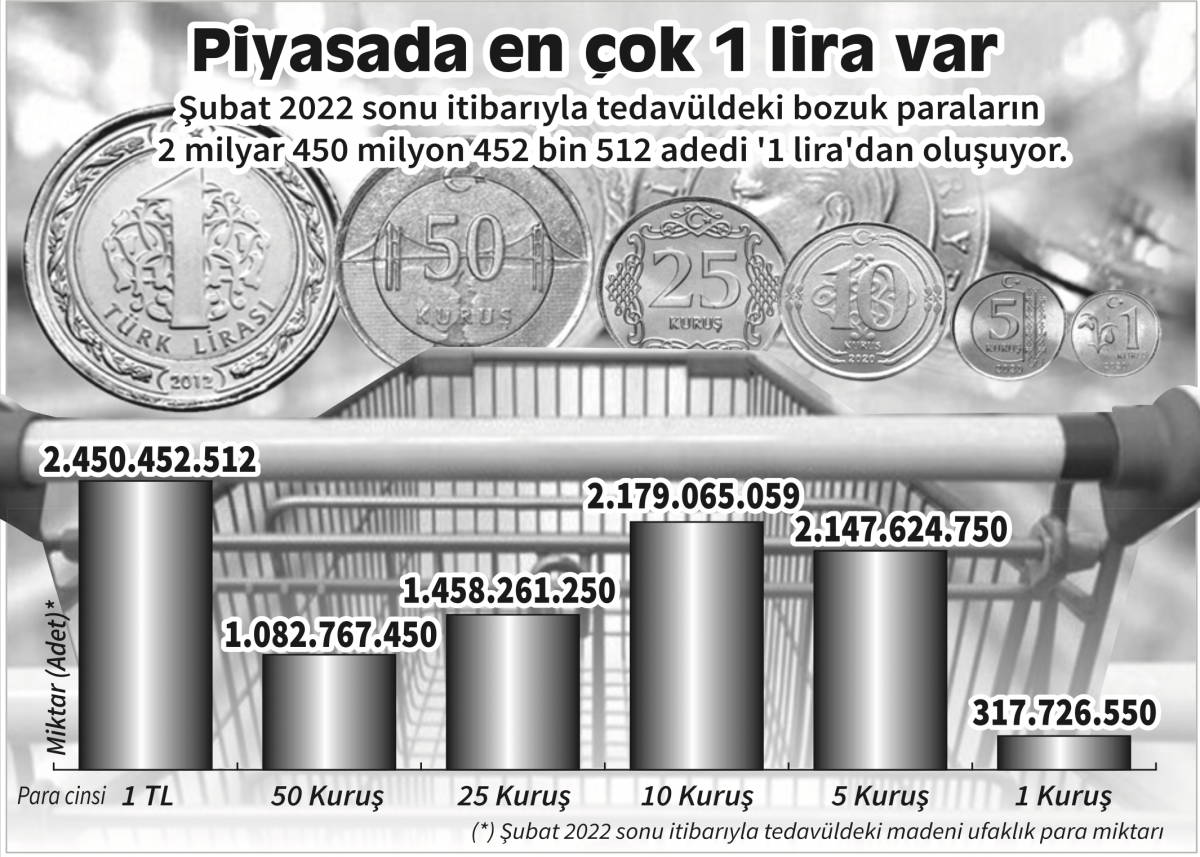 Üstelik 2021 sonuna göre, bu tür paraların tedavüldeki miktarı da daha çok yıpranma, geri çekme gibi gerekçelerle 1 kuruşta 18.7 milyon adet, 5 kuruşta 158.5 milyon adet azaldı. Tedavüldeki toplam bozuk para miktarı da 935.8 milyon azalarak 9 milyar 636 milyon adede indi. Bu kapsamda bozuk para miktarları 1 lirada 376.7 milyon, 50 kuruşta 136.6 milyon, 25 kuruşta 145.6 milyon ve 10 kuruşta 99.6 milyon adet azaldı.