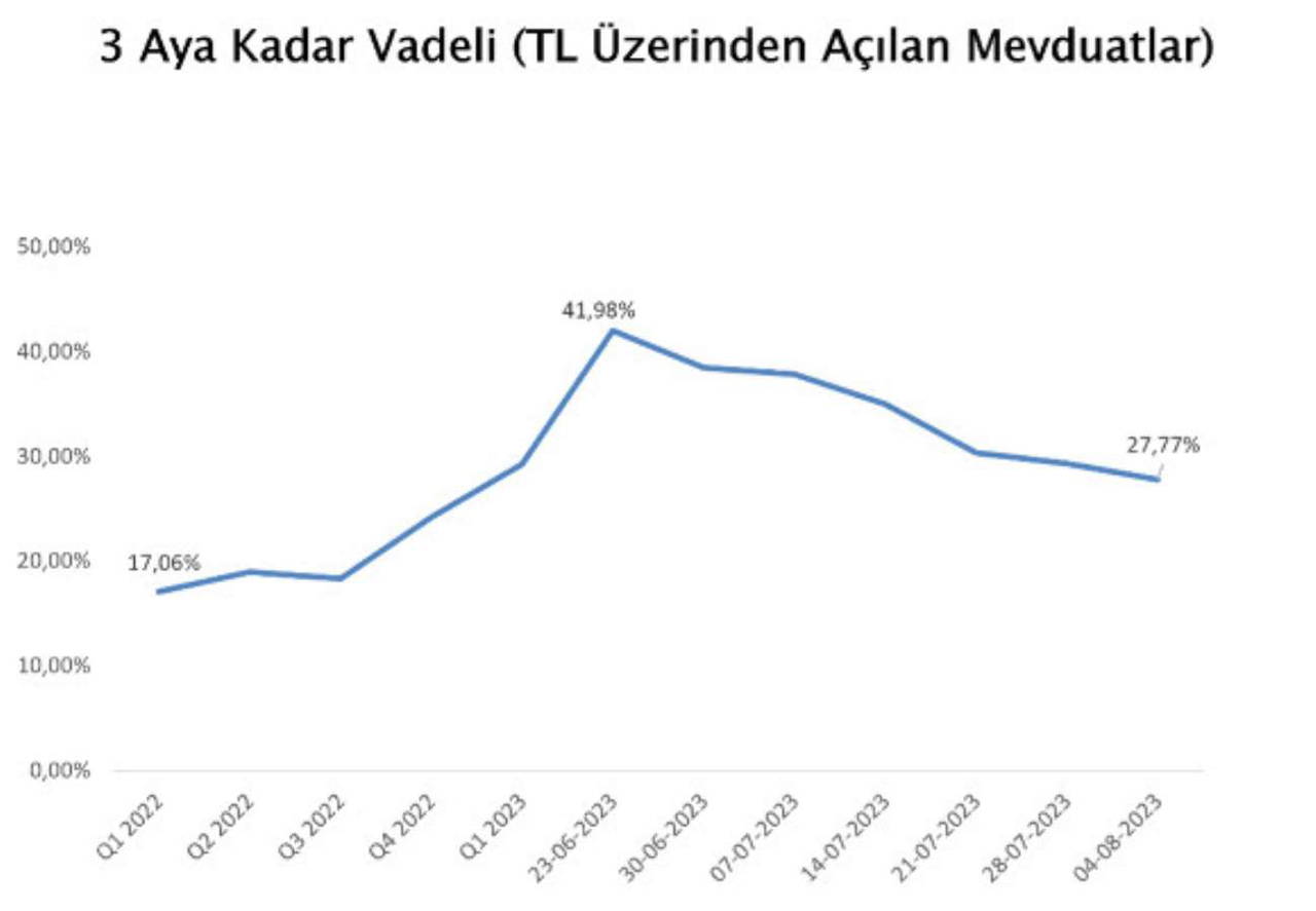 Merkez Bankası'nın verilerine göre, 1-3 ay vadeli TL mevduat faizleri 23 Haziran haftasında son 20 yılın zirvesine ulaşarak yüzde 41,98 ile zirve yaptı. 23 Haziran itibarıyla başlayan düşüş trendi nedeniyle mevduat faizleri ağustosta yüzde 27,77 seviyesine düştü.