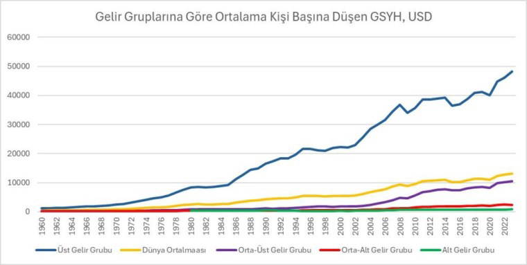 Dünya Bankası verilerine göre, 1960'tan 2023'e kadar küresel kişi başına düşen gelir 450 Amerikan Doları'ndan 13 bin 138 dolara yükseldi. Ancak bu artış, özellikle üst gelir grubuna mensup ülkelerde yoğunlaşırken, orta ve alt gelir grubundaki ülkeler bu gelişmeden yeterince faydalanamadı. 1960 ve 2023 arasındaki dönemde, üst gelir grubundaki ülkeler, ortalama kişi başına düşen GSYİH'yı 1.204 dolardan 48 bin 220 dolara yükseltirken, dünya ortalaması ile arasındaki fark 753 dolardan 35 bin 82 dolara çıktı. Türkiye, yıllık büyüme oranıyla dünya ortalamasının üzerinde olsa da bu farkı kapatmakta zorlanıyor.