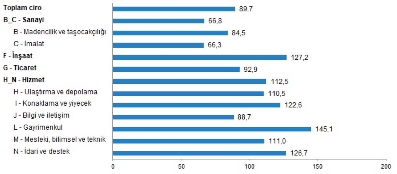 Toplam cironun alt detaylarına bakıldığında; 2022 yılı aralık ayında yıllık sanayi sektörü ciro endeksi yüzde 66.8, inşaat ciro endeksi yüzde 127.2, ticaret ciro endeksi yüzde 92.9, hizmet ciro endeksi yüzde 112.5 arttı.