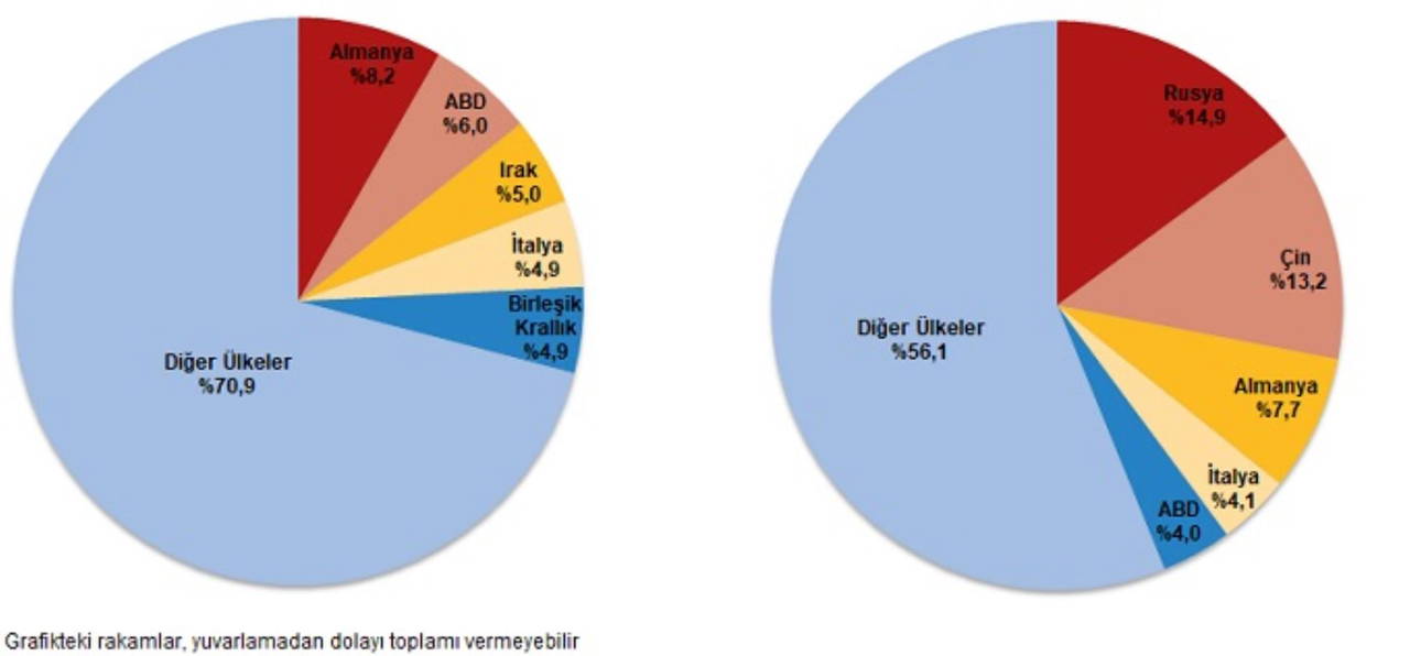 İthalatta Rusya Federasyonu ilk sırayı aldı. Nisan ayında Rusya Federasyonu’ndan yapılan ithalat 4 milyar 177 milyon dolar olurken, bu ülkeyi sırasıyla; 3 milyar 691 milyon dolar ile Çin, 2 milyar 175 milyon dolar ile Almanya, 1 milyar 153 milyon dolar ile İtalya, 1 milyar 117 milyon dolar ile ABD izledi. İlk 5 ülkeden yapılan ithalat, toplam ithalatın yüzde 43,9’unu oluşturdu.
