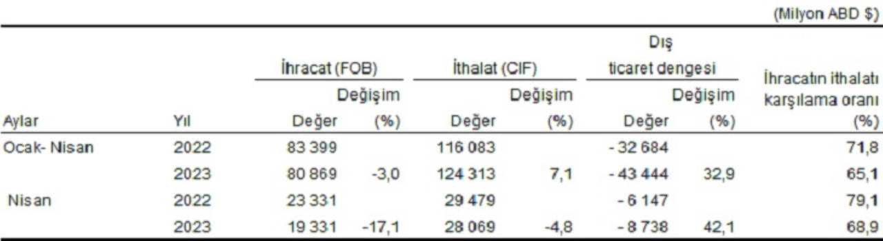 Ocak-Nisan döneminde dış ticaret açığı yüzde 32,9 artarak 32 milyar 684 milyon dolardan, 43 milyar 444 milyon dolara yükseldi. İhracatın ithalatı karşılama oranı 2022 Ocak-Nisan döneminde yüzde 71,8 iken, 2023 yılının aynı döneminde yüzde 65,1’e geriledi.