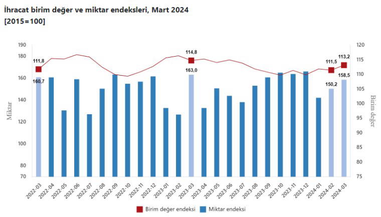 Mevsim ve takvim etkilerinden arındırılmış seriye göre ihracat miktar endeksi; 2024 Şubat ayında 155,4 iken 2024 Mart ayında yüzde 0,5 oranında azalarak 154,7 oldu. Takvim etkilerinden arındırılmış seriye göre ise ihracat miktar endeksi; 2023 yılı mart ayında 154,4 iken 2024 yılı mart ayında yüzde 5,3 oranında artarak 162,6 oldu.
