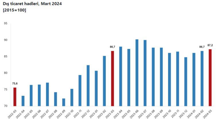 Buna göre, ihracat birim değer endeksinin ithalat birim değer endeksine bölünmesiyle hesaplanan ve 2023 yılı mart ayında 86,7 olarak elde edilmiş olan dış ticaret haddi, 0,5 puan artarak, 2024 yılı mart ayında 87,2 oldu.