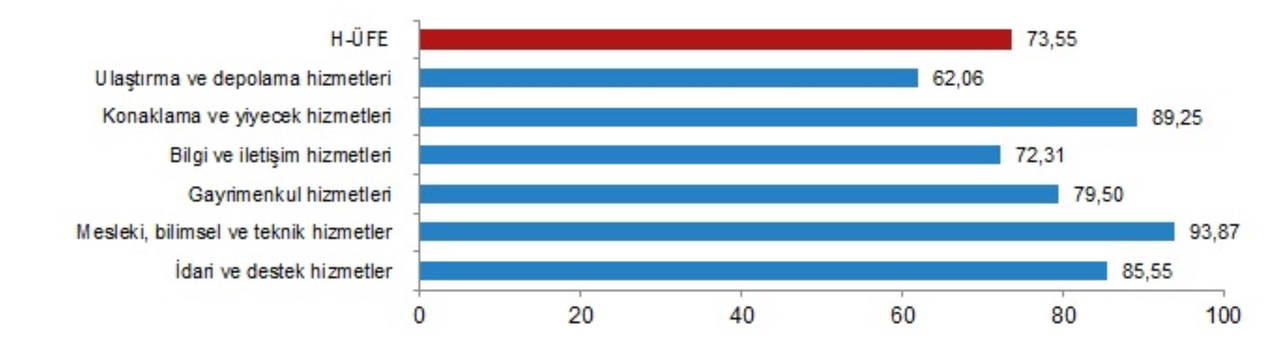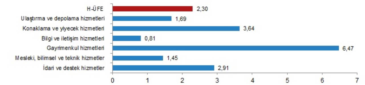 H-ÜFE sektörlerinden su yolu taşımacılığı hizmetleri yüzde 15,21, hava yolu taşımacılığı hizmetleri yüzde 51,54, telekomünikasyon hizmetleri yüzde 53,45 ile yıllık bazda endekslerin en az arttığı alt sektörler oldu. Buna karşılık programcılık ve yayıncılık hizmetleri yüzde 128,96, istihdam hizmetleri yüzde 123,21, reklamcılık ve piyasa araştırması hizmetleri yüzde 121,63 ile endekslerin en fazla arttığı alt sektörler oldu.