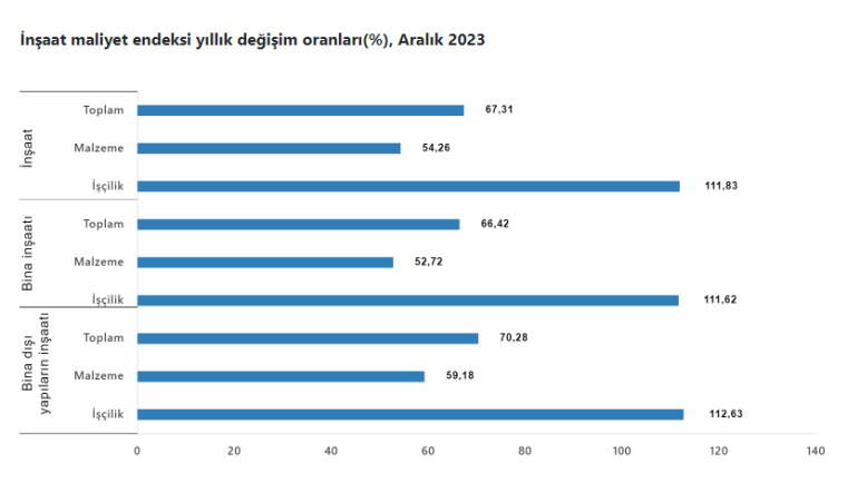 Buna göre, inşaat maliyet endeksi, 2023 yılı Aralık ayında bir önceki aya göre yüzde 1,94 arttı, bir önceki yılın aynı ayına göre yüzde 67,31 arttı.