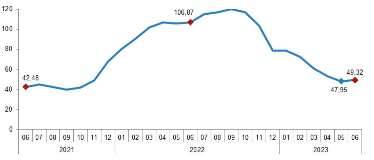 Buna göre, inşaat maliyet endeksi 2023 Haziran’da bir önceki aya göre yüzde 4,43, bir önceki yılın aynı ayına göre yüzde 49,32 arttı.