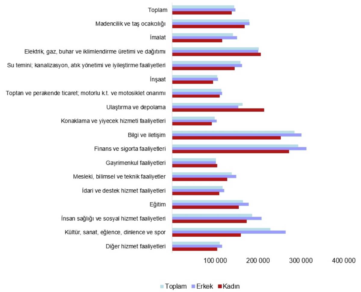 Ekonomik faaliyet sınıflamasına göre kadın çalışanların yıllık ortalama brüt kazancı ulaştırma ve depolama faaliyetinde 213 bin 810 TL, elektrik, gaz, buhar ve iklimlendirme üretimi ve dağıtımı faaliyetinde 206 bin 633 TL ve gayrimenkul faaliyetlerinde 104 bin 387 TL ile bu sektörlerdeki erkek çalışanların yıllık ortalama brüt kazancının üzerinde gerçekleşti.
