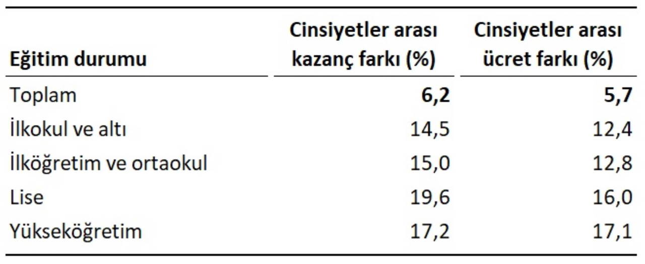 Cinsiyetler arası ücret veya kazanç farkı tüm eğitim düzeylerinde erkek lehine gerçekleşti. Yıllık ortalama brüt kazanç ile hesaplanan gösterge için en yüksek fark yüzde 19,6 ile lise mezunlarında, en düşük fark ise yüzde 14,5 ile ilkokul ve altı mezunlarda gerçekleşti. Yıllık ortalama brüt ücret-maaş ile hesaplanan gösterge için ise en yüksek fark yüzde 17,1 ile yükseköğretim mezunlarında, en düşük fark yüzde 12,4 ile yine ilkokul ve altı mezunlarda gerçekleşti.