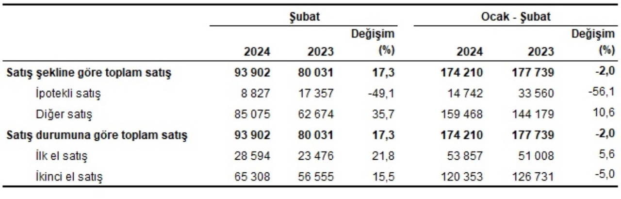 Türkiye genelinde ikinci el konut satışları Şubat ayında bir önceki yılın aynı ayına göre yüzde 15,5 artış göstererek 65 bin 308 oldu. Toplam konut satışları içinde ikinci el konut satışının payı yüzde 69,5 oldu. İkinci el konut satışları Ocak-Şubat döneminde ise bir önceki yılın aynı dönemine göre yüzde 5,0 azalışla 120 bin 353 olarak gerçekleşti.