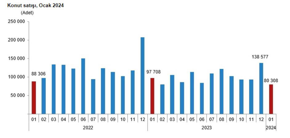 Buna göre, ocak ayında bir önceki yılın aynı ayına göre yüzde 17,8 azalarak 80 bin 308 oldu. Konut satışlarında İstanbul 13 bin 423 konut satışı ve yüzde 16,7 ile en yüksek paya sahip oldu. Satış sayılarına göre İstanbul'u 6 bin 709 konut satışı ve yüzde 8,4 pay ile Ankara, 5 bin 250 konut satışı ve yüzde 6,5 pay ile Antalya izledi. Konut satış sayısının en az olduğu iller sırasıyla 17 konut ile Ardahan, 38 konut ile Hakkari ve 40 konut ile Bayburt oldu.