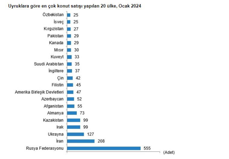 Ocak ayında Rusya Federasyonu vatandaşları Türkiye'den 555 konut satın aldı. Rusya Federasyonu vatandaşlarını sırasıyla 208 konut ile İran, 127 konut ile Ukrayna, 99 konut ile Irak ve Kazakistan vatandaşları izledi.