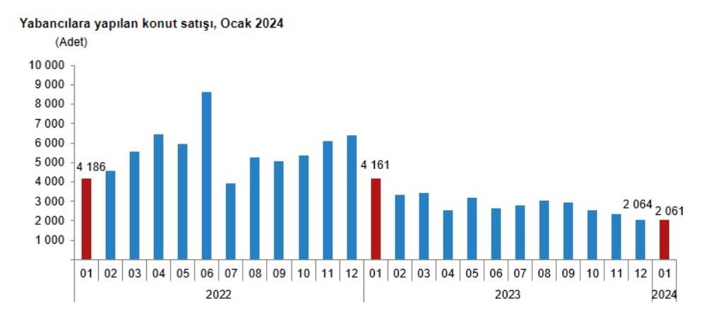 Yabancılara yapılan konut satışları Ocak ayında bir önceki yılın aynı ayına göre yüzde 50,5 azalarak 2 bin 61 oldu. Ocak ayında toplam konut satışları içinde yabancılara yapılan konut satışının payı yüzde 2,6 oldu. Yabancılara yapılan konut satışlarında ilk sırayı 747 konut satışı ile Antalya aldı. Antalya'yı sırasıyla 710 konut satışı ile İstanbul ve 211 konut satışı ile Mersin izledi.