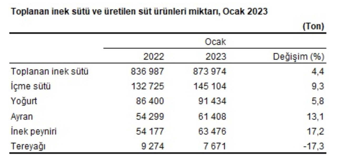 Ocak ayında bir önceki yılın aynı ayına göre, inek peyniri üretimi yüzde 17,2, ayran üretimi yüzde 13,1, içme sütü üretimi yüzde 9,3 ve yoğurt üretimi yüzde 5,8 artarken; tereyağı üretimi yüzde 17,3 azaldı.