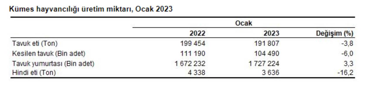 Buna göre, ocak ayında bir önceki yılın aynı ayına göre tavuk yumurtası üretimi yüzde 3,3 artarken; tavuk eti üretimi yüzde 3,8, kesilen tavuk sayısı yüzde 6 ve hindi eti üretimi yüzde 16,2 azaldı.