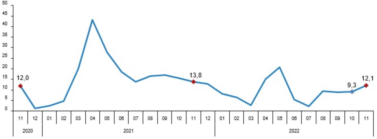 Sabit fiyatlarla perakende satış hacmi 2022 yılı kasım ayında bir önceki yılın aynı ayına göre yüzde 12.1 arttı. Aynı ayda gıda, içecek ve tütün satışları yüzde 5.7, gıda dışı satışlar (otomotiv yakıtı hariç) yüzde 17,7, otomotiv yakıtı satışları ise yüzde 3,9 arttı.