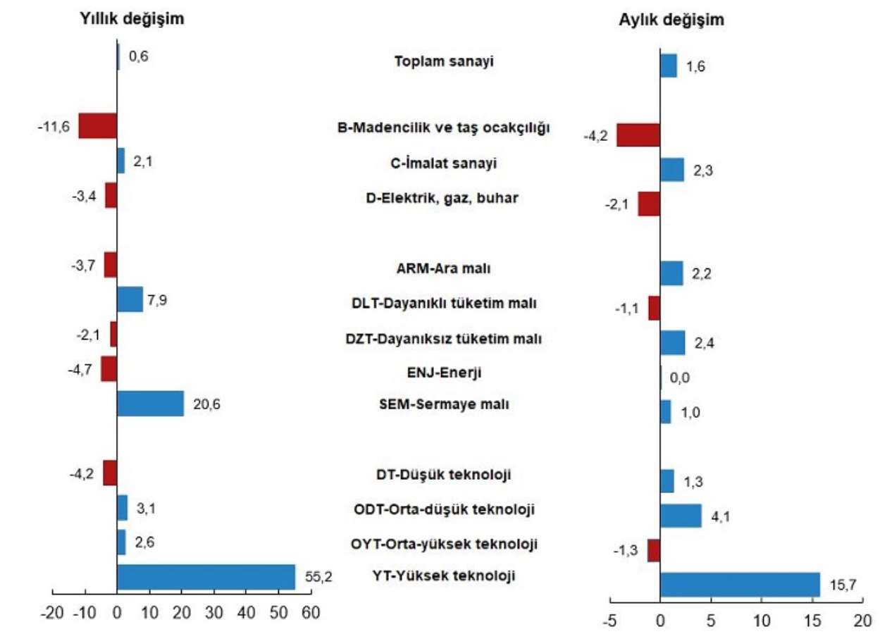 Madencilik ve taş ocakçılığı sektörü endeksi bir önceki aya göre ise yüzde 4,2 azaldı, imalat sanayi sektörü endeksi yüzde 2,3 arttı ve elektrik, gaz, buhar ve iklimlendirme üretimi ve dağıtımı sektörü endeksi yüzde 2,1 azaldı.