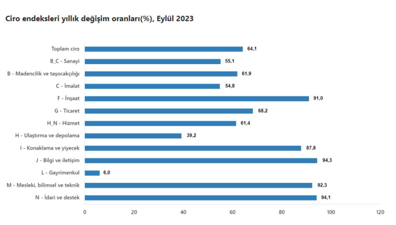 Buna göre, sanayi, inşaat, ticaret ve hizmet sektörleri toplamında ciro endeksi, 2023 yılı Eylül ayında yıllık yüzde 64,1 arttı.