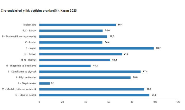 Toplam cironun alt detaylarına bakıldığında; 2023 yılı Kasım ayında yıllık sanayi sektörü ciro endeksi yüzde 54,6, inşaat ciro endeksi yüzde 98,7, ticaret ciro endeksi yüzde 71,3, hizmet ciro endeksi yüzde 61,2 arttı.