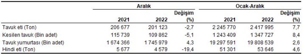 Aralık ayında bir önceki yılın aynı ayına göre tavuk yumurtası üretimi yüzde 4,3 artarken; tavuk eti üretimi yüzde 2,7, kesilen tavuk sayısı yüzde 5,1 ve hindi eti üretimi yüzde 19,4 azaldı. Ocak-aralık döneminde bir önceki yılın aynı dönemine göre kesilen tavuk sayısı yüzde 8,4, tavuk eti üretimi yüzde 7,7, hindi eti üretimi yüzde 4,6 ve tavuk yumurtası üretimi yüzde 2,6 arttı.