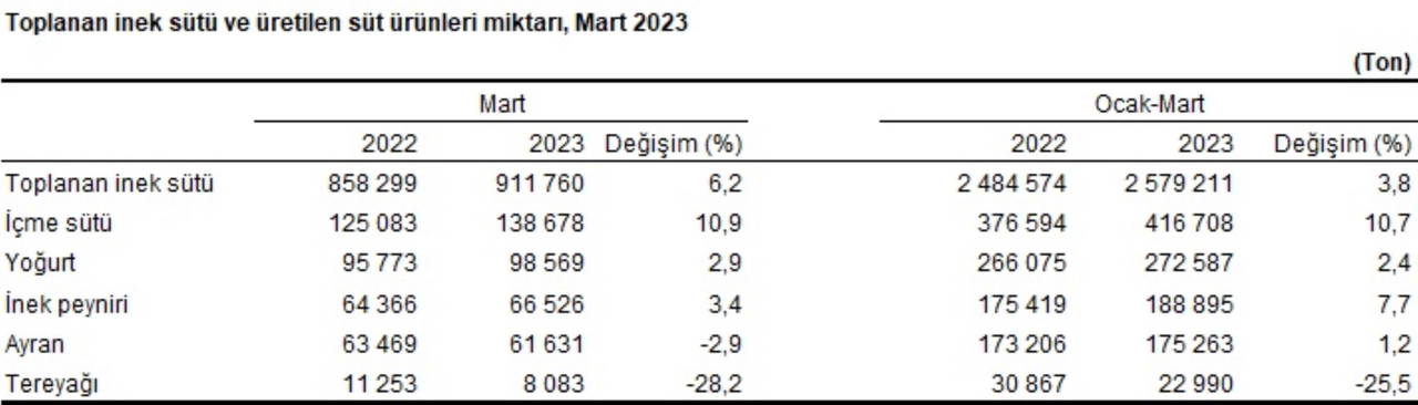 Mart ayında bir önceki yılın aynı ayına göre içme sütü üretimi yüzde 10,9, inek peyniri üretimi yüzde 3,4 ve yoğurt üretimi yüzde 2,9 arttı. Ayran üretimi ve tereyağı üretiminde ise düşüş kaydedildi. Ayran üretimi yüzde 2,9, tereyağı üretimi yüzde 28,2 azaldı.