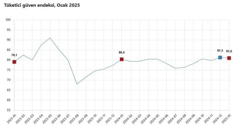 Türkiye İstatistik Kurumu (TÜİK) ocak ayı Tüketici Güven Endeksi verilerini açıklandı. Tüketici eğilim anketi sonuçlarına göre hesaplanan endeks, aralık ayında 81,3 seviyesindeyken, ocak ayında yüzde 0,4 düşerek 81,0 oldu.