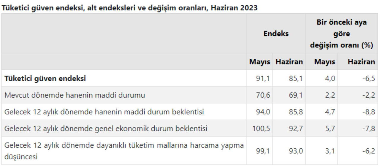 Türkiye İstatistik Kurumu ve Türkiye Cumhuriyet Merkez Bankası işbirliği ile yürütülen tüketici eğilim anketi sonuçlarından hesaplanan tüketici güven endeksi, mayıs ayında 91,1 iken haziran ayında yüzde 6.5 oranında azalarak 85.1 oldu.