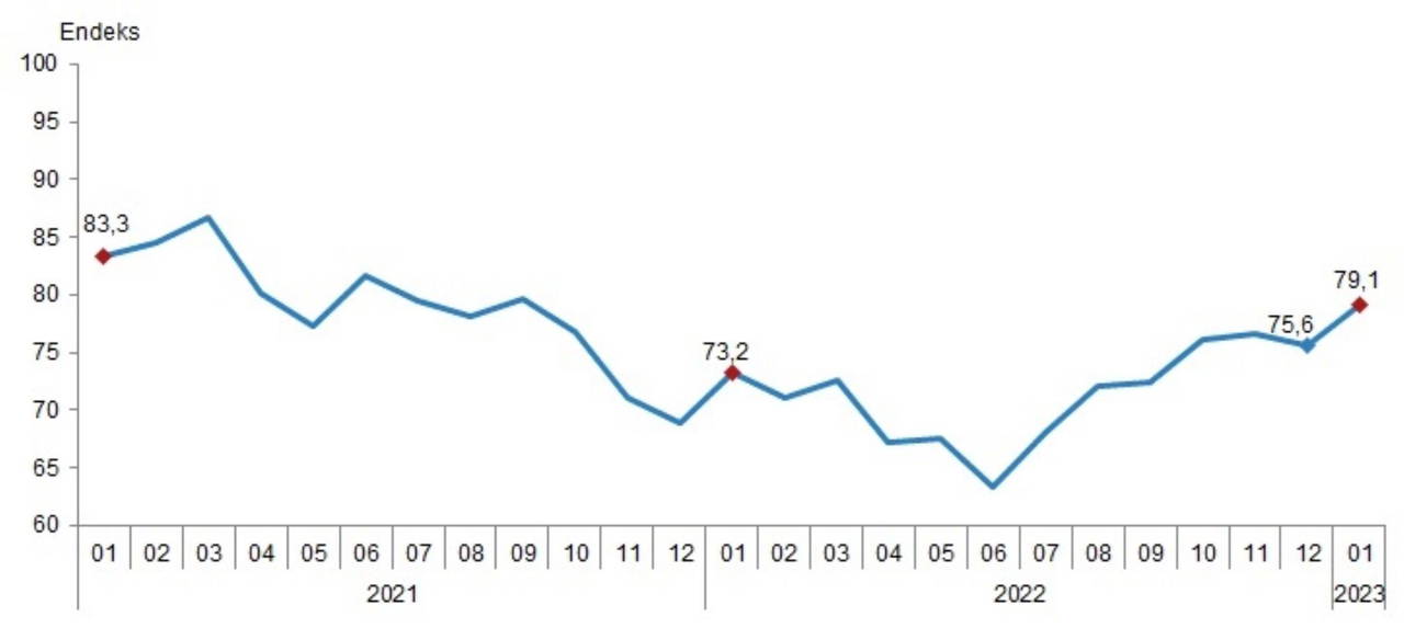 Türkiye İstatistik Kurumu (TÜİK) ve Türkiye Cumhuriyet Merkez Bankası işbirliği ile yürütülen tüketici eğilim anketi sonuçlarından hesaplanan Tüketici Güven Endeksi, Ocak ayında bir önceki aya göre yüzde 4.6 oranında arttı; Aralık ayında 75.6 olan endeks, ocak ayında 79.1 oldu.