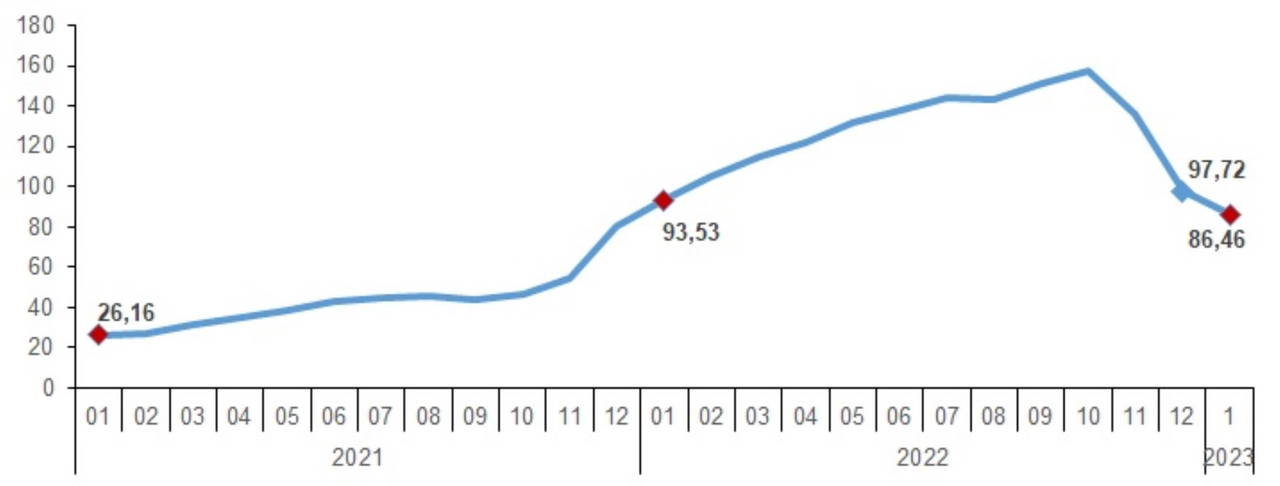 Buna göre, Yİ-ÜFE 2023 yılı ocak ayında bir önceki aya göre yüzde 4,15, bir önceki yılın aynı ayına göre yüzde 86,46 ve on iki aylık ortalamalara göre yüzde 125,53 artış gösterdi.