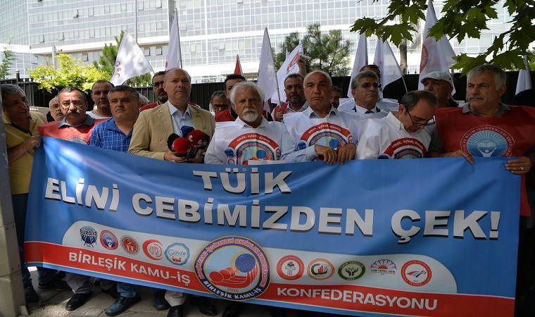 Birleşik Kamu-İş Konfederasyonu, TÜİK’in enflasyon verilerini açıklamasının ardından TÜİK binası önünde “TÜİK elini cebimizden çek” pankartı açarak açıklanan oranları protesto etti.