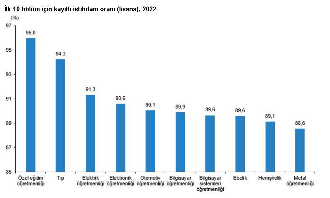 Lisans seviyesinde en yüksek kayıtlı istihdama sahip olan bölümler; yüzde 96 ile özel eğitim öğretmenliği, yüzde 94,3 ile tıp, yüzde 91,3 ile elektrik öğretmenliği, yüzde 90,6 ile elektronik öğretmenliği, yüzde 90,1 ile otomotiv öğretmenliği oldu.