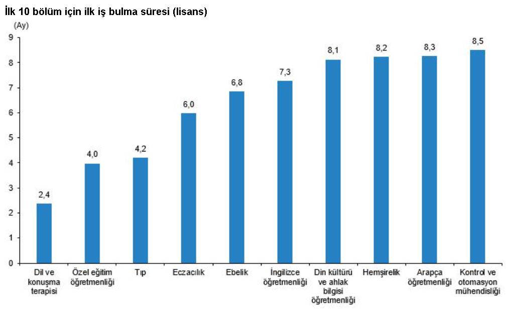 Lisans mezunlarında ortalama ilk iş bulma süresi, 2022'de bir önceki yıla göre artarak 13,6 aydan, 13,9'a çıktı. Ön lisans mezunlarının ortalama ilk iş bulma süresi ise 2021 yılına göre artarak 14,8 aydan, 15,3 aya yükseldi.