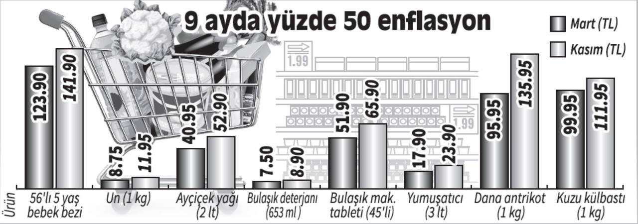 Cumhuriyet olarak biz de ekonominin ısınmaya başladığı mart ayından itibaren seçtiğimiz bazı ürünlerdeki fiyat hareketlerini izledik. Sembolik enflasyon sepetimizde 23 Mart günü 45 lira 50 kuruşa satılan 16 rulo tuvalet kâğıdı, 4 Aralık itibarıyla yüzde 30 artışla 64 lira 90 kuruşa çıkmış durumda. 6 lira 45 kuruşa satılan 100 gramlık Türk kahvesi yüzde 34’lük artışla 9 lira 75 kuruşa satılırken artışın şampiyonluğunu ise 1990’lı yıllarda depolarda dolu olduğu için neredeyse bedava dağıtılan, diyetisyen Ayşe Baysal’a kampanyalar yaptırılan yeşil mercimek aldı. Artık ithal edilmek zorunda olan yeşil mercimeğin kilosu Martta 15.25 TL’ye satılırken yüzde 47 artarak 28.50 TL’ye çıktı.