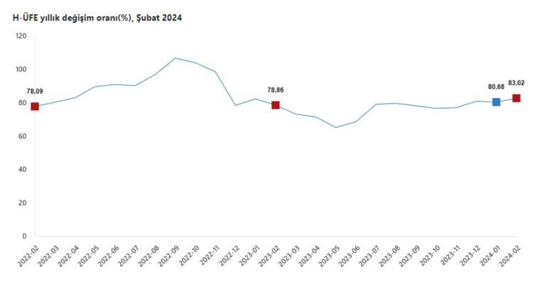 H-ÜFE 2024 yılı şubat ayında bir önceki aya göre yüzde 2,94 artış, bir önceki yılın Aralık ayına göre yüzde 18,64 artış, bir önceki yılın aynı ayına göre yüzde 83,02 artış ve on iki aylık ortalamalara göre yüzde 77,02 artış gösterdi.