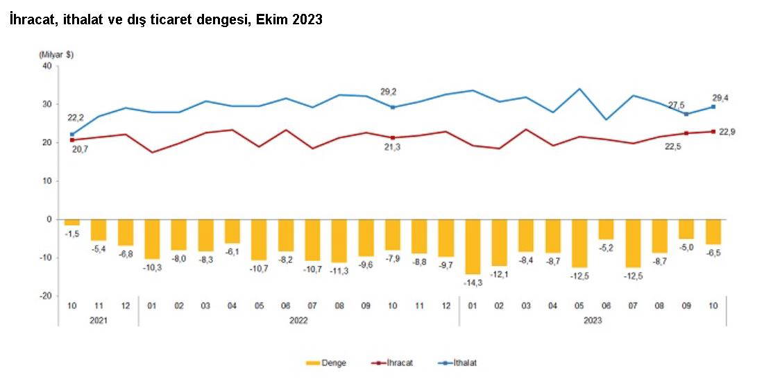 Ekim ayında dış ticaret açığı, bir önceki yılın aynı ayına göre yüzde 17,5 azalarak 7 milyar 902 milyon dolardan, 6 milyar 519 milyon dolara geriledi. 2022 Ekim ayında yüzde 72,9 olan ihracatın ithalatı karşılama oranı, 2023 Ekim ayında yüzde 77,8'e yükseldi. Ocak- ekim döneminde dış ticaret açığı, yüzde 3,2 artarak 91 milyar 44 milyon dolardan, 93 milyar 917 milyon dolara yükseldi. 2022 Ocak- Ekim döneminde yüzde 69,7 olan ihracatın ithalatı karşılama oranı, 2023 yılının aynı döneminde yüzde 69,1'e geriledi.