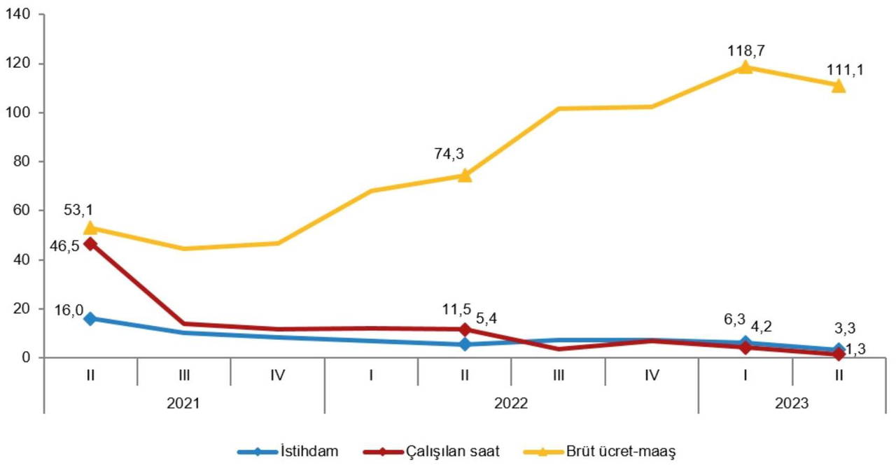 Sanayi, inşaat ve ticaret-hizmet sektörleri toplamında brüt ücret-maaş endeksi, 2023 yılı ll. çeyreğinde bir önceki çeyreğe göre yüzde 12,8 arttı. Alt sektörler incelendiğinde, endeks; sanayi sektöründe yüzde 12,3, inşaat sektöründe yüzde 11,3 ve ticaret-hizmet sektörlerinde yüzde 13,3 arttı.