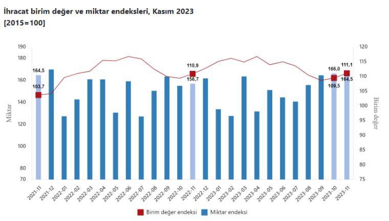 İhracat birim değer endeksi kasım ayında bir önceki yılın aynı ayına göre yüzde 0,2 arttı. Endeks bir önceki yılın aynı ayına göre gıda, içecek ve tütünde yüzde 1,0 arttı, ham maddelerde (yakıt hariç) yüzde 5,9 azaldı, yakıtlarda yüzde 19,0 azaldı, imalat sanayinde (gıda, içecek, tütün hariç) yüzde 1,7 arttı.