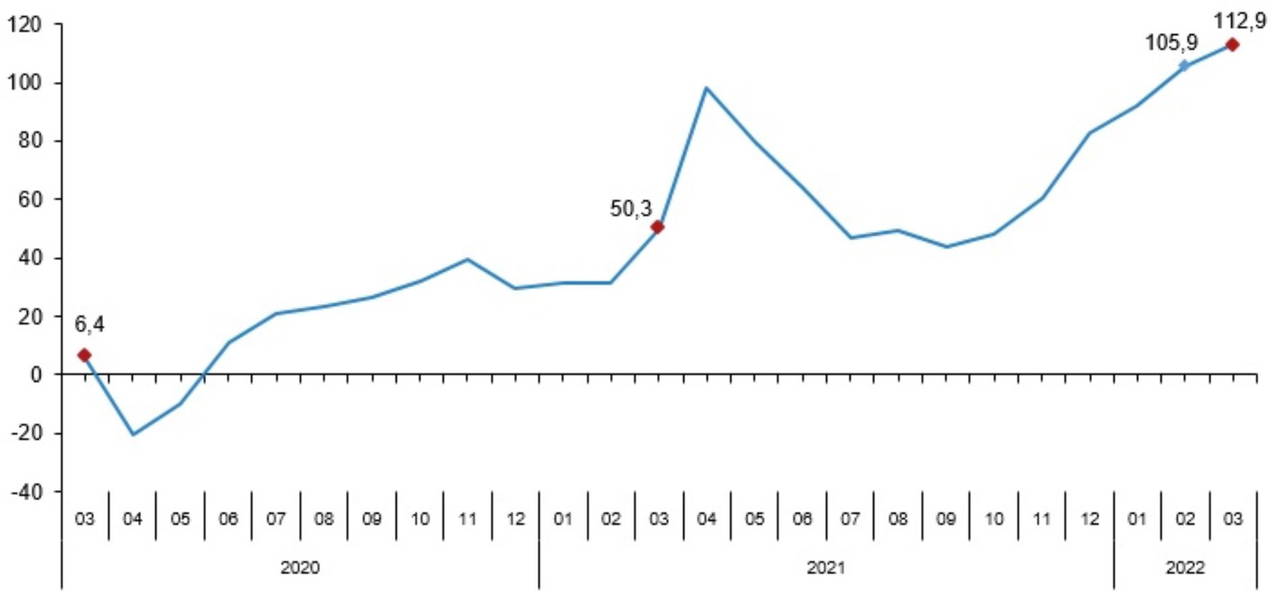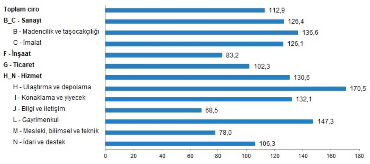 TÜİK verilerine göre; sanayi, inşaat, ticaret ve hizmet sektörleri toplamında ciro endeksi (2015=100), 2022 yılı Mart ayında yıllık yüzde 112,9 arttı.