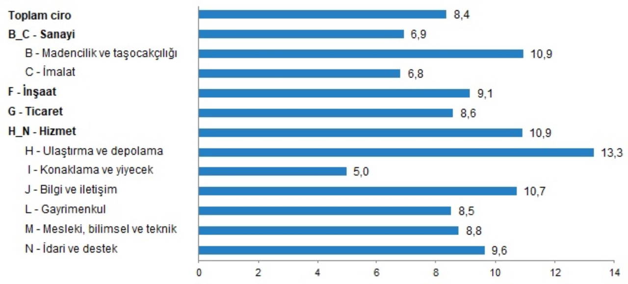 Toplam cironun alt detaylarına bakıldığında; 2022 yılı Mart ayında aylık sanayi sektörü ciro endeksi yüzde 6.9, inşaat ciro endeksi yüzde 9.1, ticaret ciro endeksi yüzde 8.6, hizmet ciro endeksi yüzde 10.9 arttı.