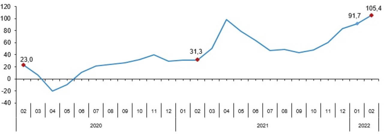 Sanayi, inşaat, ticaret ve hizmet sektörleri toplamında ciro endeksi (2015=100), 2022 yılı Şubat ayında yıllık yüzde 105,4 arttı. Toplam cironun alt detaylarına bakıldığında; 2022 yılı Şubat ayında yıllık sanayi sektörü ciro endeksi yüzde 123,6, inşaat ciro endeksi yüzde 55,2, ticaret ciro endeksi yüzde 94,1, hizmet ciro endeksi yüzde119,6 arttı.