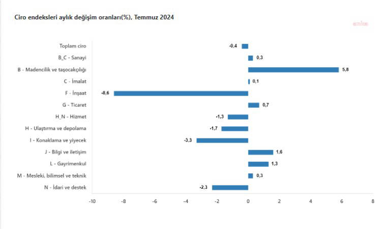 Sanayi, inşaat, ticaret ve hizmet sektörleri toplamında ciro endeksi, temmuz ayında aylık yüzde 0,4 azaldı. Toplam cironun alt detaylarına bakıldığında; temmuz ayında aylık sanayi sektörü ciro endeksi yüzde 0,3, ticaret ciro endeksi yüzde 0,7 arttı. Hizmet ciro endeksi yüzde 1,3, inşaat ciro endeksi yüzde 8,6 azaldı.