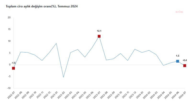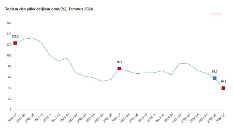 Türkiye İstatistik Kurumu (TÜİK) verilerine göre, temmuz ayında toplam ciro yıllık yüzde 39,8 artarken, aylık yüzde 0,4 azaldı. Böylece toplam ciro, haziran ayına göre geriledi.