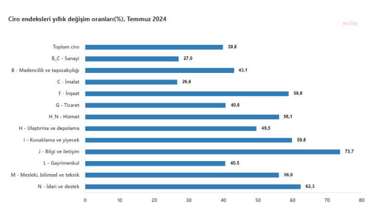 Toplam cironun alt detaylarına bakıldığında; temmuz ayında yıllık sanayi sektörü ciro endeksi yüzde 27, inşaat ciro endeksi yüzde 58,8, ticaret ciro endeksi yüzde 40,6, hizmet ciro endeksi yüzde 56,1 arttı.